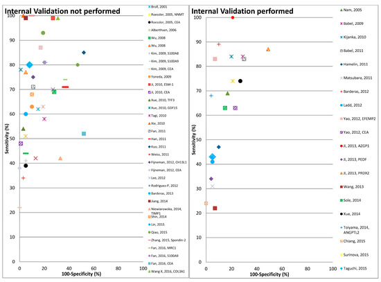 Overall the diagnostic performance of all markers from the 47 studies included in the review varied widely, with the sensitivity, specificity and Area under the ROC curve (AUC) ranging from 22–100%, 48–100% and 0.464–0.989 respectively (Table 3 and Table 4). The number of proteins evaluated ranged from 1 to 12. Eighteen out of 47 studies performed some form of correction for overoptimism. In Figure 2 the diagnostic performances of the studies are plotted (sensitivity on y-axis and 1-specificty on x-axis) with respect to internal validation performed by these studies for correction of overoptimism. As shown in this figure the studies with internal validation typically reported somewhat lower sensitivities at comparable levels of specificity, than studies without internal validation.