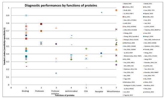 The 83 identified protein biomarker candidates identified from the cell line secretome and tumor tissue proteome represent different classes of proteins. Apart from CEA (identified in 24 studies), only few proteins have been identified in more than one study (CEA in 24 studies, CA 19-9 in four studies, S100A9 and LRG1 in three studies each and ACVR2B, AZGP1, GDF15, MAPKAPK3, PIM1 in two studies each). Supplementary Materials Table S3 provides information on the molecular and biological function and location with cellular component of the proteins as identified from the UniProt database [19]. Thirty-nine proteins function as binding (DNA-, RNA-, metal-ion- or ATP-) proteins, while eight are protease inhibitors, followed by seven each that function as antimicrobial. Overall, a large variety of biological functions were represented. For example, eleven proteins were found to be involved in apoptosis and in cell adhesion each, eight in inflammatory response and other six proteins in transcription. As shown in Figure 3 when diagnostic performances of proteins were represented by molecular function of these markers the best performances were seen for some of the binding (DNA-, RNA-, metal-ion- or ATP-) proteins and proteases, followed by protease inhibitors and antimicrobials.
