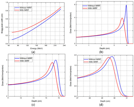With the IMRF, the Bragg peak width (defined as the width between the proximal 80% and the distal 80% dose curve) was increased by 0.18 cm at the lowest energy, about 70 MeV, and the increase was only about 0.04 cm at the highest energy. Examples of pristine Bragg peaks with and without IMRF for low, medium, and high energies are shown in Figure 1.