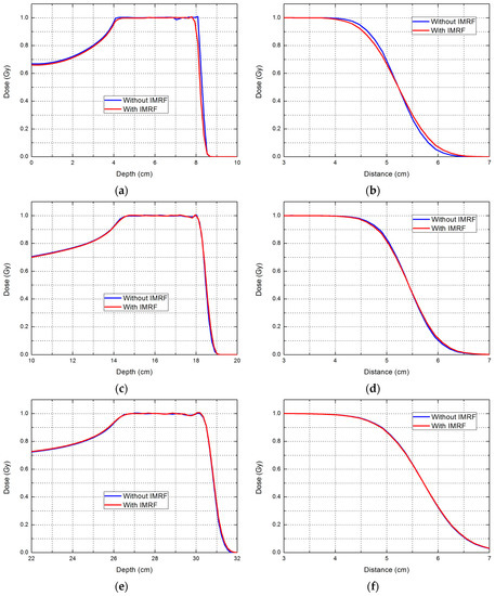 The IMRF also increased the lateral and distal penumbras (Table 2). The increase in the lateral penumbra ranged from 0.02 to 0.12 cm, and these increases became smaller as energy increased. The difference in the distal penumbra was negligible, with a maximum value of 0.06 cm.