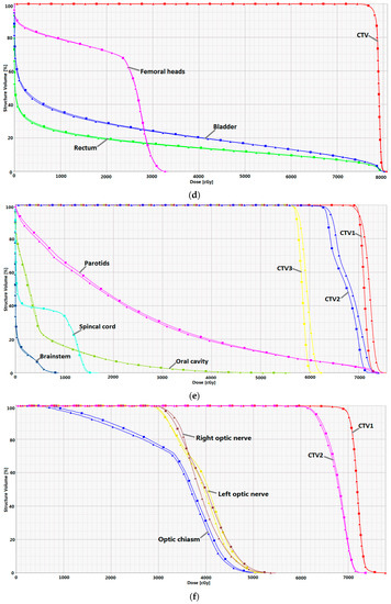 Dose-volume histograms with IMRF (line with squares) and without IMRF (line with triangles). (a) scalp case; (b) brain case; (c) lung case; (d) prostate case; (e) head and neck (H & N) case; and (f) base of skull (BOS) case. CTV, clinical target volume.