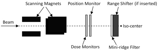 In this study, the beam data required by the TPS were provided by the vendor, so the hardware design details of the IMRF were not discussed. We noticed that the design of the IMRF has many factors to consider [3]. In this study, the mini-ridge filter was placed just above the range shifter, as shown in Figure 5. A possible alternative location could be near the exits of the synchrotron. With this placement, some of the phase space parameters of the proton beam could be recovered by the magnets along the beam transport line so that the spot size would not be affected. The convenient replacement of the mini-ridge filter is another concern. Since the mini-ridge filter is a small structure in the synchrotron nozzle, slight damage could alter its dosimetric characteristics, so the design of the mini-ridge filter should be easy to replace when there is damage or other issues.