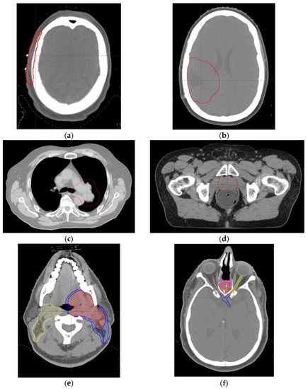 Representative target volumes in the transverse plains for the cases in this study. (a) scalp case; (b) brain case; (c) lung case; (d) prostate case; (e) H & N case; and (f) BOS case. For (a–d), the red contour is the clinical target volume (CTV). For (e), the red, blue, and yellow contours are CTV1, CTV2, and CTV3, respectively. For (f), the red and magenta contours are CTV1 and CTV2, respectively; and the yellow, brown, and blue contours are the left optic nerve, right optic nerve, and optic chiasm, respectively.