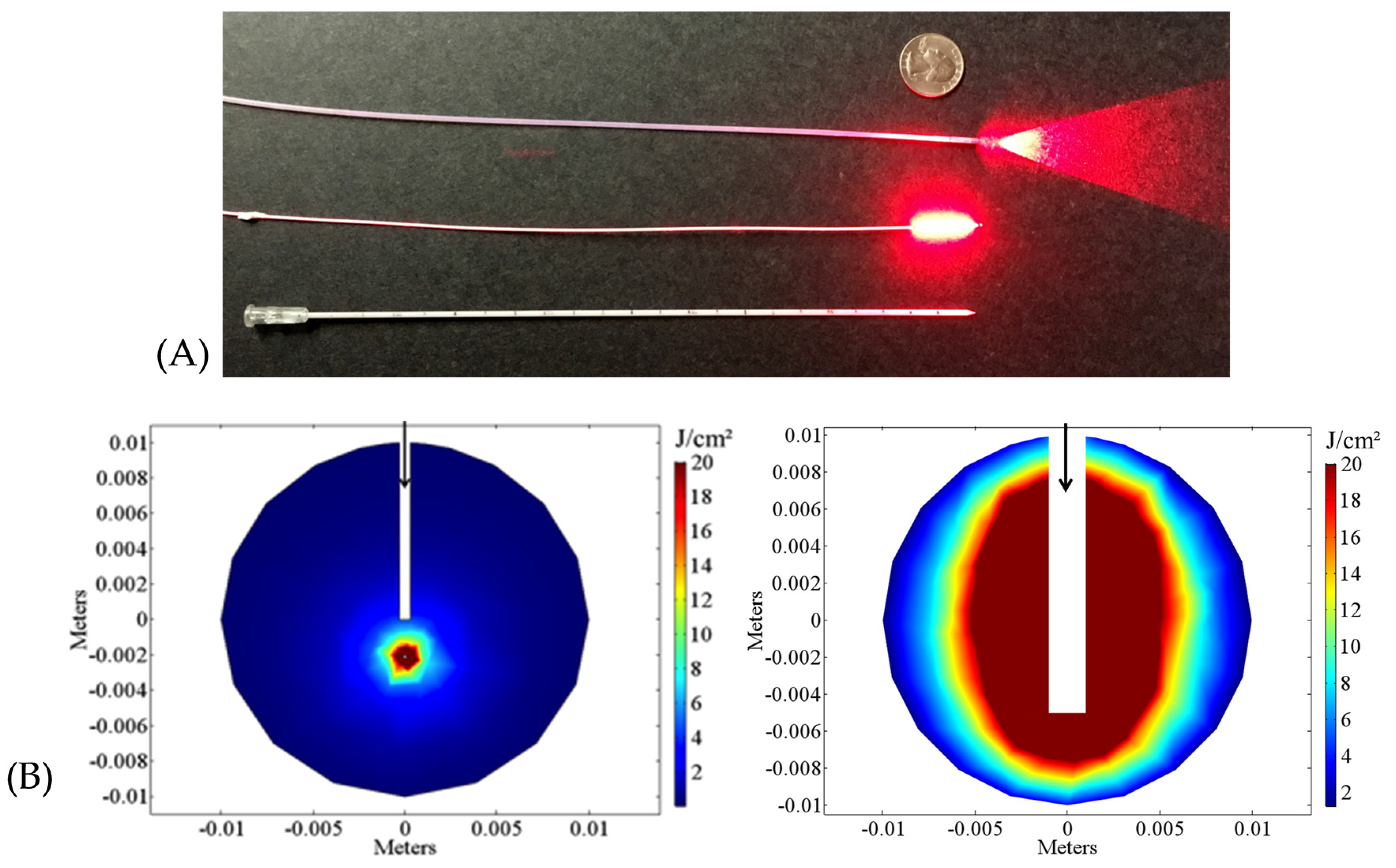 Laser treatment fibers. (A) A typical 600-µm-diameter flat-cut (top), a 0.98-mm-diameter 1-cm cylindrical diffuser fiber emitting red laser light (middle), and an optically transparent plastic catheter with a 2-mm-outer diameter and a 1.45-mm-inner diameter (bottom) that can be used for insertion of cylindrical diffusers [10]; (B) Computer simulation of light propagation from a flat-cut fiber (bottom left), and a 1-cm cylindrical diffuser (bottom right) in a catheter. The black arrows point to the location of the fibers in a 2-cm-diameter spherical geometry with optical properties set to be similar to those measured for 652-nm light in a head and neck tumor by Robinson et al. [12]. A detailed description of the mathematical model and basic assumptions are given in Shafirstein et al. and Oakley et al. [13,14]. In interstitial photodynamic therapy (I-PDT), the light energy density (J/cm2) or light dose is calculated as dose volume histogram (DVH), which is the minimum light dose absorbed in a certain percentage (typically 90%) of the target volume [15].