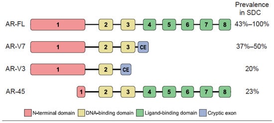 The full-length AR (AR-FL) gene consists of eight exons, of which exons 4–8 encode the ligand-binding domain. Expression of alternative AR isoforms lacking the ligand-binding domain (which normally serves as a binding site for anti-androgens, such as enzalutamide) is associated with ADT resistance in prostate cancer [46,47,48,49,50]. AR-V7, a constitutively active AR splice variant that includes only exons 1–3 and a cryptic exon 3, is detected in 37%–50% of SDCs (Figure 1) [8,26]. On average, AR-V7 is expressed at around 5% of AR-FL RNA levels [8], which is similar to the AR-V7/AR-FL ratio seen in prostate cancer [16]. Another AR isoform, AR-V3, including only exons 1, 2 and a cryptic exon 2, is also found in SDC but at lower rates and only in male patients [26]. AR-45, which lacks the majority of exon 1, including the N-terminal domain that mediates ligand-independent transactivation of AR [51], is detected in a minority of SDCs [26]. However, the association between the alternative AR isoforms and response to ADT in SDC, and the prevalence of AR-V7, AR-V3, and AR-45 in other types of SGC, remains unknown.