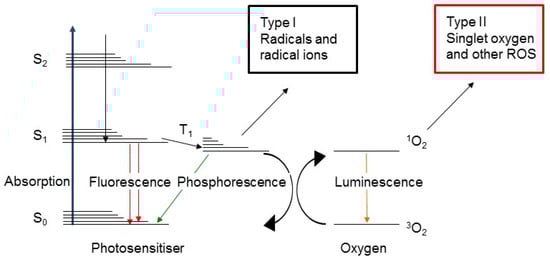 Although the precise mechanism of action of PDT is an ongoing topic of investigation, its molecular effects are accepted to be based on the reaction of a light activated PS with other molecules, creating radicals [13]. Illumination of a PS leads to the absorption of a photon and promotes the PS to its excited singlet state, or S1, in which an electron is shifted towards a higher-energy orbital (Figure 1). From this unstable and typically short-lived state, the PS can return to its ground state S0 by converting its energy into heat or fluorescence, a feature which can be used for the purposes of diagnostics and optical monitoring [14]. Alternatively, intersystem crossing can occur resulting in the population of the PS as excited triplet state T1. In this T1 state, the PS can transfer its energy by phosphorescence or by colliding with other molecules to create chemically reactive species via two types of reactions [13,15]. T1 can react with a number of organic substrates or solvents and transfer an electron or a proton to form radical anion or cation species, respectively. Typically, the PS reacts with an electron donating substrate to form PS—that subsequently reacts with oxygen to form superoxide anion radicals. This is called a type I reaction. In a type II reaction, T1 reacts directly with ground state oxygen 3O2 by transfer of energy to form singlet oxygen 1O2 which is a highly reactive oxygen species (ROS) [15]. The exact molecular mechanisms of these photochemical reactions have been described in detail elsewhere [16].