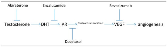 Metastatic PC is associated with higher VEGF levels than localized disease [66,67,68]. Thus, anti-VEGF therapies have been the target of multiple clinical trials for treatment of men with CRPC. Bevacizumab is a monoclonal antibody to VEGF-A which has been shown to decrease tumor volume in many cancers. However, in clinical trials for treatment of CRPC, it has not improved the overall survival time of patients getting chemotherapy (docetaxol) along with the immunosuppressant prednisone [69]. Therefore, it is thought that angiogenesis may play a smaller role in CRPC than other cancers and current studies are investigating dual targeting of both androgen signaling and VEGF.