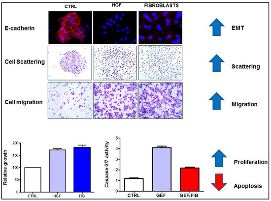 Hepatocyte growth factor (HGF) or HGF-producing fibroblasts (FIB) promote epithelial-mesenchymal transition (EMT), associated with inhibition of E-cadherin expression (red fluorescence), enhance cell scattering and migration, increase proliferation of cancer cells and confer resistance to apoptosis. The cell migration assay shows the number of cells that migrated through the membrane of a transwell chamber. Apoptosis is shown as increased caspase-3/7 activity in gefitinib (GEF)-treated colon cancer cells, which is blocked by fibroblasts. The figure is modified from our recent publication [24].