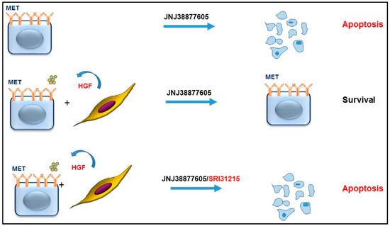 We demonstrated that HGF or HGF-producing fibroblasts conferred resistance to EGFR targeting therapy by reactivation of pro-survival pathways in cancer cells, including ERK and AKT activation [24]. Inhibition of the MET kinase activity by JNJ38877605 or inhibition of the biological activity of HGF by SRI31215, a novel small molecule inhibitor of pro-HGF activation, restored sensitivity of HGF-producing colon cancer cells to EGFR inhibition by blocking autocrine MET activation. SRI31215 or JNJ38877605 also overcame resistance mediated by HGF-producing fibroblasts, demonstrating that inhibition of HGF/MET signaling prevents tumor-microenvironment-mediated resistance to targeted therapy (Figure 5). Co-inhibition of EGFR and MET promotes eradication of colon cancer stem cells, resulting in durable tumor regression [55].