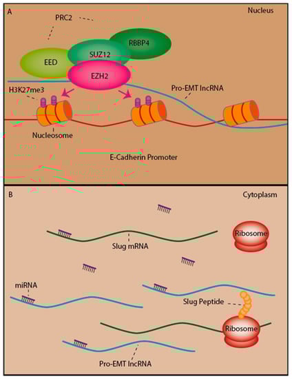 A depiction of two major gene regulatory mechanisms through which lncRNAs can promote epithelial mesenchymal transition (EMT), one taking place the nucleus and the other in the cytosol. (A) Recruitment of the PRC2 complex to the promoter of a gene which inhibits EMT (in this case E-cadherin) resulting in trimethylation of H3K27 (H3K27me3) and gene silencing; (B) Binding of pro-EMT lncRNAs to anti-EMT microRNAs, liberates translation of mRNA targets which induce EMT, (in this case Slug).