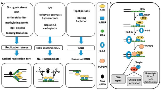 The DNA damage response (DDR) is critical to protect cells from the high levels of DNA damage sustained on a continuous basis. The vast majority of this damage is unavoidable as it is generated endogenously (e.g., reactive oxygen species) or a result of normal environmental exposure (e.g., UV). The DDR is a highly coordinated system involving cell cycle checkpoints, which prevent damage becoming fixed by DNA replication or passed on to daughter cells at mitosis and provide the necessary pause for repair, and the DNA repair pathways themselves. Ataxia telangiectasia mutated and Rad3 related (ATR) kinase is a PIKK family member with similar structure to ataxia telangiectasia mutated (ATM) and DNA-PKcs that also have key roles in the DDR. The principal phosphorylation target of ATR is checkpoint kinase 1 (CHK1) and the function of both of these kinases is critical to cell cycle control and the maintenance of genomic integrity in response to DNA damage and replication stress. Homozygous disruption of ATR or CHK1 is lethal in early embryonic life [5,6], underlying the critical role that these protein kinases play. The development of kinase dead ATR (ATR-KD) cells, where an inactive form of ATR acts as a dominant negative inhibitor to native ATR function led to the demonstration that ATR-KD cells were sensitive to DNA damaging agents and did not arrest at the G2/M checkpoint (see Section 3), suggesting a role for ATR in both DNA damage repair and cell cycle checkpoint regulation [7]. The principal activator of the ATR-CHK1 pathway is replication stress that is common in cancers, particularly those with activated oncogenes and dysfunctional G1/S checkpoint control [8]. At the molecular level ATR is activated by the presence of single stranded DNA (ssDNA) that arises out of stalled replication forks, nucleoside excision repair (NER) intermediates or resected DSBs that have been subject to exonuclease digestion [9,10,11]. There is some evidence that the level of ATR activation is dependent of the amount of replication protein A (RPA) and therefore the length of ssDNA that is present [12]. Lesions that result in the presence of a length of ssDNA result from a wide variety of exogenous and endogenous DNA damaging agents (Figure 1A).