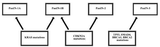 Mutations in the carcinogenesis of pancreatic adenocarcinoma. Pancreatic intraepithelial neoplasia (PanIN) grading.
