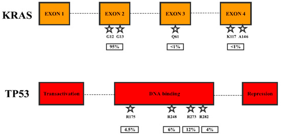 Most frequent mutations in pancreatic cancer. KRAS mutations by the exons and TP53 mutations by protein domain.
