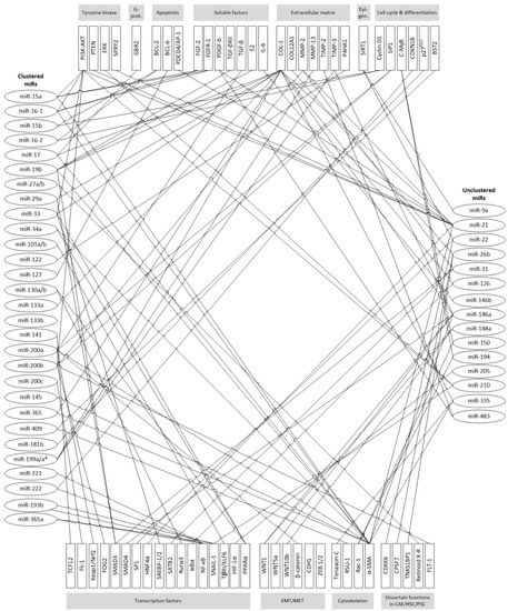 Currently known miR target structures in CAF/HSC/PSC. Targets are grouped according to main cellular functions, miRs are ordered in clusters (left), unclustered miRs are grouped on the right side.