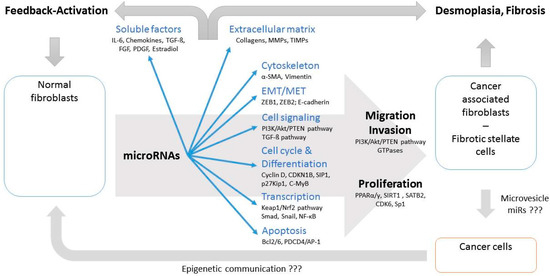 The aim of this review was to summarize the current understanding on: (a) how miRs are involved in cancer cell—tumor environment/stroma communication, specifically the transformation of NFs into CAFs, their involved targets and signaling pathways in these interactions; and (b) whether CAF-related miR expression profiles are clinically relevant. By reviewing the literature we also found evidence that miRs have very similar roles in the activation of hepatic (HSC) and pancreatic stellate cells (PSC) which are also specifically activated fibroblasts being part of precancerous fibrotic diseases, like pancreatic and hepatic fibrosis. HSC and PSC are major determinants of the well-known phenomenon desmoplasia and are considered as significant part of the precancerous microenvironment in fibrotic tissue, esp. in these two organs. Therefore, miR-related similarities and differences related to tumor-related cellular dysfunctions between the various types of activated fibroblasts were included in this review.