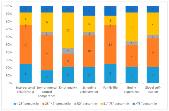 Global self-esteem reported by boys and girls was mostly below the 50 percentile (58.5%), especially on the following scales: interpersonal relationships (75%), environmental control competence (62.5%), academic success (62.5%), family life (75%), bodily experience (50%) and emotionality (37.5%). Figure 1 shows these results.