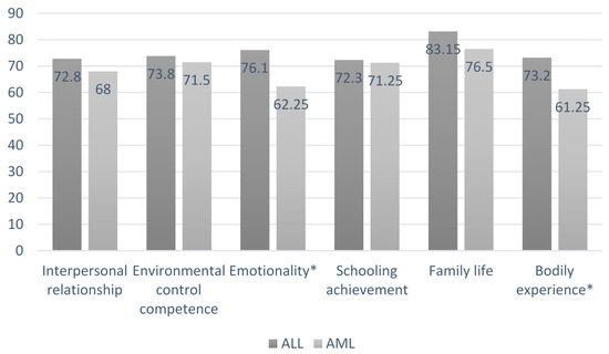 The independent sample t-test showed significant mean differences in the emotionality scale (t = 2.23; degree of freedom (df) = 24; p = 0.03) and in the bodily experience scale (t = 3.02; df = 24; p = 0.006) depending on the survivor’s type of leukaemia. Examining the expected marginal means, survivors of AML showed lower scores in the emotionality (Mean (M) = 65.25; Standard Deviation (SD) = 7.84) and in the bodily experience (M = 61.25; SD = 6.47) self-esteem scales than ALL survivors (respectively, M = 76.10; SD = 8.76; M = 73.2; SD = 10.78) as shown in Figure 2.