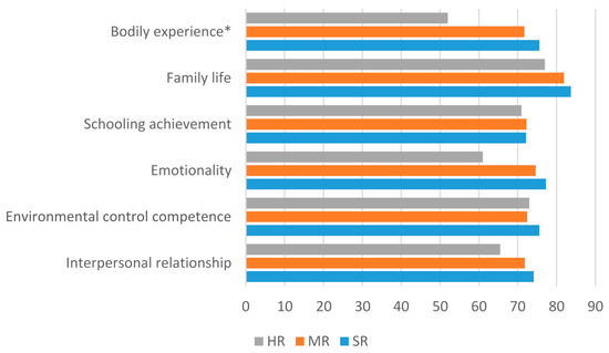 The Analysis of Variance (ANOVA) showed significant mean differences in the bodily experience scale (F = 12.31; df = 2, p = 0.0001) depending on the survivors’ assigned risk band (Standard Risk: SR; Medium Risk: MR; High Risk: HR). Bonferroni post hoc analysis identified the scores reported by children treated for a high risk leukaemia as significantly lower from those treated respectively for a standard-risk leukaemia (Mean difference = −23.57; SD = 4.78; p = 0.0001) and medium-risk leukaemia (Mean difference = −19.73; SD = 4.48; p = 0.001) (Figure 3).
