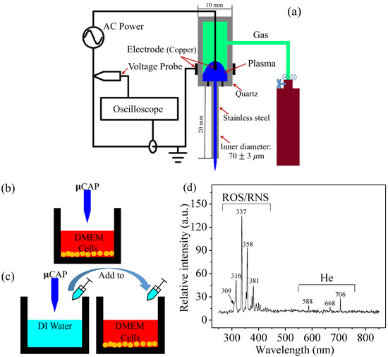 (a) Schematic representation of the micro-sized cold atmospheric plasma setup; (b) µCAP direct treatment: µCAP was directly applied to cells in DMEM (100 µL); (c) µCAP indirect treatment: DI water was treated with µCAP and then applied to cells in DMEM (70 µL DMEM + 30 µL treated DI water); (d) Optical emission spectrum detected from the He µCAP using UV-visible-NIR, in the 250–850 nm wavelength range. ROS: reactive oxygen species; RNS: reactive nitrogen species; CAP: cold atmospheric plasma; µCAP: micro-sized CAP; DMEM: Dulbecco’s Modified Eagle Medium; DI: Deionized; µCAP: Micro-sized cold atmospheric plasma; AC: Alternating current.
