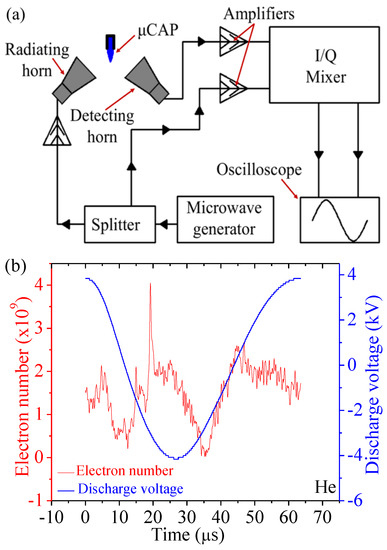 The experimental Rayleigh microwave scattering (RMS) system is shown in Figure 2a. The dependence of the output RMS signal on parameters of the scattering channel can be expressed as , where is the proportionality coefficient () and is the plasma volume. The volume of the plasma column was determined from intensified charged-coupled device (ICCD) images. is plasma conductivity using the following expression: , , where is the frequency of the electron-neutral collisions, is the plasma density, and is the angular frequency [36,37]. Combining these equations yields . Therefore, we can calculate the total electron number in the plasma as . The electron number of He µCAP is presented in Figure 2b, and the total electron number for one discharge period is .
