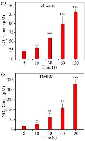 µCAP treatment of DI water and Dulbecco’s Modified Eagle Medium (DMEM) were performed to induce changes in the concentration of ROS and RNS as a function of the treatment time. Indeed, as shown in Figure 3, the NO2− concentration in He µCAP-treated DI water and DMEM increases with treatment duration. The NO2− mainly originates as NO (N2 + e 2N + e, N + O2 NO + O, 4NO + O2 + 2H2O 4NO2− + 4H+) [38,39,40], while most of NO is formed in the gas phase during the afterglow a few milliseconds after the discharge pulse. The NO2− concentration in DMEM treated with He µCAP is higher than that in DI water (p < 0.05 for all treatment times). On the other hand, DMEM comprises over 30 components such inorganic salts, amino acids and vitamins, while the effect of plasma irradiation on these compounds is still unknown. Plasma might react with amino acids to form NO2−, which provides a possible explanation for higher NO2− concentration in DMEM than in DI water. Plasma-activated media produces a lot of species, including NO3−. In our previous study, the Ph range of plasma solutions was around 5.0 to 6.0 [16]. On the other hand, different concentrations of H2O2 show a Ph range from 4.5 to 6.2. Therefore, Ph of cap should be between 4.5 and 6.0.