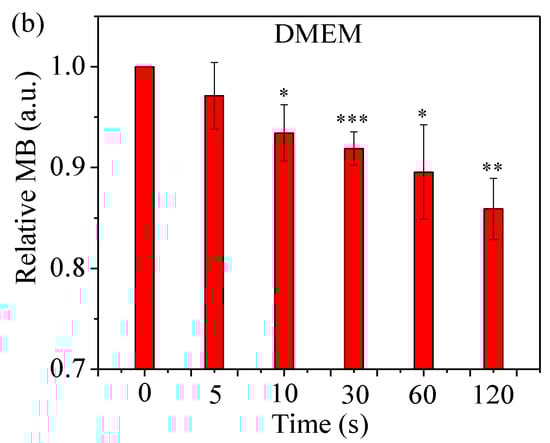 Relative methylene blue (MB) concentration for assessing the concentration of hydroxyl free radicals in He µCAP-treated DI water (a) and DMEM (b). Student t-test was performed, and the statistical significance compared to MB without µCAP treatment (0 s) is indicated as * p < 0.05, ** p < 0.01, *** p < 0.001. (n = 3).