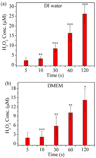 H2O2 concentration in µCAP-treated DI water (a) and DMEM (b). Student t-test was performed, and the statistical significance compared to µCAP 5 second treatment is indicated as * p < 0.05, ** p < 0.01, *** p < 0.001. (n = 3).