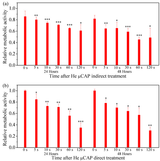 Cell viability of U87MG after 24 and 48 h of incubation with He µCAP indirect treatment (a) and direct treatment (b) for 0, 5, 10, 30, 60, and 120 s. The ratios of surviving cells for each cell line were calculated relative to controls (0 s) in DMEM. Student t-test was performed, and the statistical significance compared to cells present in DMEM (0 s) is indicated as * p < 0.05, ** p < 0.01, *** p < 0.001. (n = 3).