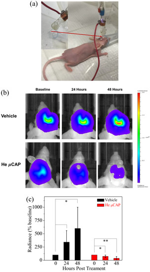 All animal protocols were approved by the George Washington University Institutional Animal Care and Use Committee. Eight-week-old female athymic nude mice (Charles River, NU(NCr)-Foxn1nu) were anesthetized intraperitoneally (i.p.) (Ketamine (100 mg/kg) mixed with Xylazine (10 mg/kg)) and placed in a stereotaxic frame. The surface of the skull was visualized with a dissecting microscope and horizontally leveled between bregma and lambda. A small hole was drilled at the desired location. U87MG-RedFluc cells (Perkin Elmer), containing a red-shifted firefly luciferase that allows for in vivo monitoring of tumor growth via light emission, were resuspended in DMEM at a concentration of 5 × 105 cell/µL and injected into the frontal lobe at the following coordinates (relative to Bregma) using a Hamilton syringe: 2.2 mm ventral from the dorsal surface of the skull, 1.0 mm caudal, and 2.0 lateral. Then, 5 × 105 cells were injected at a depth of 2.2 mm and the syringe was then retracted to 1.8 mm and an additional 5 × 105 cells were then administered. To allow for delivery of µCAP, an endoscopic tube was then implanted at a depth of 2.2 mm and secured in place with dental cement. Mice were allowed to recover for 7 days and He µCAP or vehicle control (He alone) was then administered. In brief, mice were anesthetized with isofluorane and CAP was applied via the implanted endoscopic tube at 5-s intervals, followed by 15 s off, for a total CAP treatment time of 15 s. The jet was removed from the endoscopic tube to allow for venting of He. Tumor size was estimated using in vivo bioluminescent imaging before and for up to 48 h post CAP or vehicle treatment. For bioluminescent imaging, animals were anesthetized with isoflurane and the substrate luciferin was administered i.p., (150 mg/kg). The mice were then transferred to the light-sealed imaging cabinet of an IVIS Lumina K machine and positioned in a nose cone in order to maintain anesthesia. Bioluminescent images were acquired using a charge-coupled device camera cooled to −80 °C to achieve maximal sensitivity. Images were acquired at 10 min post substrate injection with an exposure time of 20 s, medium binning, F/Stop = 1, and EM gain off.