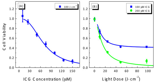 (A) Drug-dose and (B) light-dose response curves for cell viability of A549 cells treated with Indocyanine green (ICG)-mediated photodynamic therapy (PDT). Cells were incubated with ICG for 5 h and then irradiated at 800 nm. Cell viability was measured by the standard MTT (3-(4,5-dimethylthiazol-2-yl)-2,5-diphenyltetrazolium) survival assay. The solid lines are best fits to the experimental data using a logistic function in Origin software.