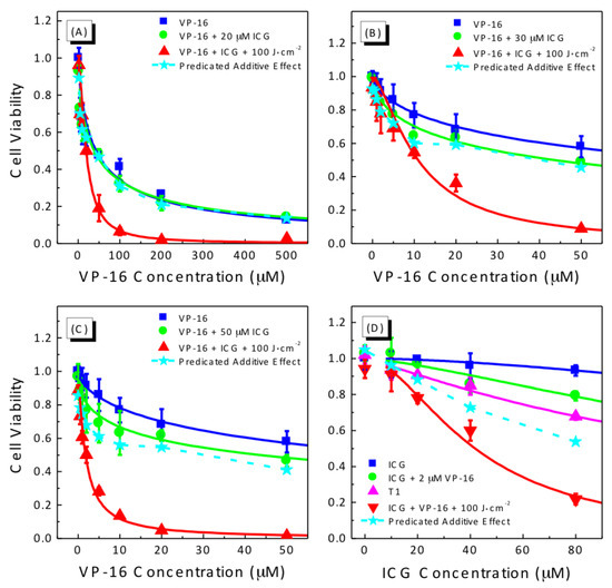 Previously, Gantchev et al. suggested that the mechanism for synergistic enhancement of cytotoxicity produced by the combination of metallic phthalocyanine-mediated PDT and VP-16 is PDT-induced depletion of intracellular glutathione (GSH), an antioxidant that is believed to be able to reduce the highly cytotoxic radicals of VP-16 [46]. In order to see whether this mechanism is responsible for the synergism observed in the present study, we performed an experiment in which the cells were treated with VP-16 immediately after laser irradiation (see Section 2.4). We would have observed synergistic enhancement of cytotoxicity, if the ICG-PDT treatment induced cellular damages, which were expected to last for hours following laser irradiation [21], had potentiated the cytotoxicity of VP-16. In contrast, the results in Figure 5 indicate that the strong synergy induced by the combination of ICG-PDT and VP-16 is not likely due to ICG-PDT-produced cellular damages but should involve direct or indirect interaction between ICG and VP-16 during the course of laser irradiation.