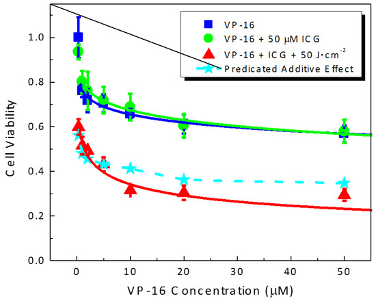 In addition, we performed fractional effect analysis and the expected additive effects were plotted as dashed lines and filled stars in Figure 3. With laser irradiation, the observed combination effects were found to lie below the additive effect curves for all the concentrations of ICG and VP-16 evaluated in this experiment, confirming a synergistic enhancement of cytotoxicity by the combination treatment of ICG-PDT and VP-16 in a wide range of drug concentrations and light doses.