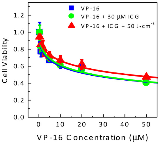 Whether or not the presence of VP-16 during laser irradiation was required for synergistic enhancement of cytotoxicity was investigated. In this experiment, A549 cells were incubated with ICG for 4 h and then irradiated at 800 nm. After laser irradiation, cells were incubated with VP-16 for 4 h. MTT assay was performed 45 h after the removal of VP-16. The results are shown in Figure 5.