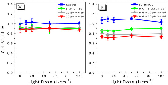 Cytotoxicity of laser-irradiated mixtures of ICG and VP-16 in A549 cells. Cells were treated with (A) photo-irradiated VP-16 in cell culture medium and (B) photo-irradiated mixtures of ICG and VP-16 in cell culture medium for 4 h. Cell viability was evaluated by using the standard MTT assay.