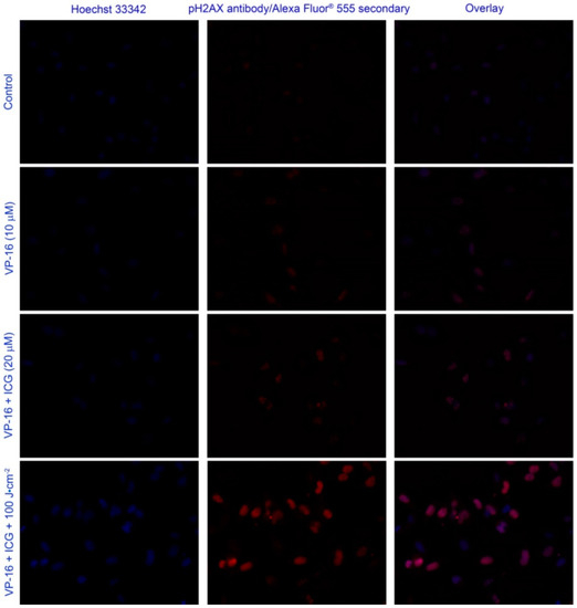 Phosphorylation of histone 2AX (H2AX), a member of the histone 2A family is a marker of DNA double-strand breaks (DSBs). The HCS DNA damage kit (Invitrogen, Life Technologies Inc., Burlington, ON, Canada) was used to measure the yield of DNA DSBs induced by the combination treatment of ICG-PDT and VP-16. A549 cells were seeded and treated with drugs and laser irradiation as described in Section 4.5. At the end of the incubation period (18 h), cells were fixed, permeabilized, and stained following the manufacturer’s protocol without further modification. The images were taken on a Nikon Eclipse TS100/TS100-F microscope with filter sets of Ex/Em of BP510–560/LP590 nm and BP330–380/LP420 nm for Alexa Fluor® 555 and Hoechst 33342, respectively. All the images were taken with an exposure time of 6 s. Background images were taken for each channel under the same experimental conditions. The final images presented are corrected images obtained after subtracting the background images using Photoshop software (Adobe Systems Inc., San Jose, CA, USA).