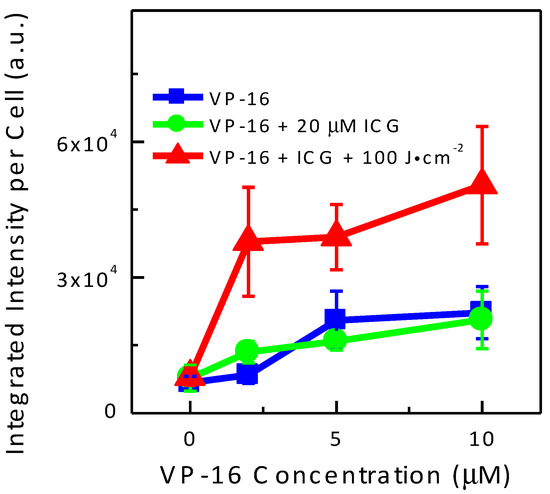 It has been suggested that the relative yield of DNA DSBs could be measured more accurately by using the total area of γH2AX foci than the total number of the foci [42]. Therefore, we plotted the average of integrated fluorescence intensity of the red channel as a function of VP-16 concentration in Figure 8. Intensity of γH2AX foci increased with increasing VP-16 concentration. When cells were treated with ICG and VP-16, the intensity of γH2AX foci was not changed significantly in A549 cells. These results indicated that increased generation of DNA DSBs by the combination treatment of ICG-PDT and VP-16 was at least partially responsible for the synergistic enhancement of cytotoxicity observed in MTT experiments.