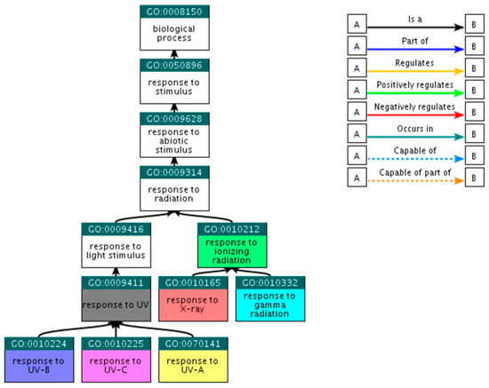 Beginning with the broad GO term ‘response to radiation’ through the QuickGO platform (http://www.ebi.ac.uk/QuickGO) [21], child GO terms that fall within the selected criteria were explored. Since QuickGO provides only the direct descendants of each term, the search for direct descendants for the resultant GO terms was repeated until all child terms of the initial input were collected. At this step, 55 GO terms were retrieved, among which only 7 were eligible as sufficient, i.e., there was no need of including further child terms (Table 1). The hierarchical relations of the selected GO terms are presented at Figure 1, including the initial GO term ‘response to radiation’; however, this term was not included in the final selection.