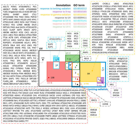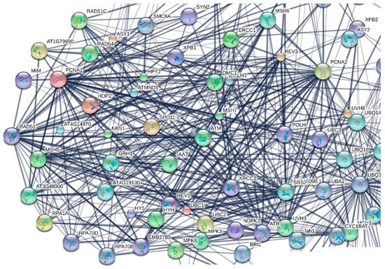 The basic idea was to discover through in silico analysis those genes that could serve as reliable biomarkers or a ‘global tool’ for the development of a ‘non-mammalian radiation dosimetry’. Using meta-analysis and bioinformatics procedures, Nikitaki et al. [18,19] have recently identified unique human gene biomarkers specific for different types of cellular stresses (e.g., IR, replication or oxidative stress), pointing out the potential application, in terms of experimental exploitation and technical advancement, of the selected gene products in the detection of harmful environmental stresses. The investigation described herein has been expanded to develop an in silico-plant-based platform, useful for REM in a non-mammalian and relatively inexpensive model, such as plants (‘the plant radiation dosimeter’). From a biophysical point of view, IR and non-IR exhibit substantially different DNA damage patterns, thus inducing different DDR pathways dominated by distinct genes/proteins [20]. The expected differences in radiation-induced damage at the protein/lipid level could also account for different profiles of gene induction. To this end, we focused on those genes encoding products that serve as ‘exclusive’ biomarkers for the in planta detection of radiation exposure and identification of radiation quality. These universal biomarkers could be expressed in different plant populations/communities specifically linked to different geographical areas. As for radiation quality, attention was given to genes responsive to X-rays, γ-rays and non-IR (UV-A, UV-B or UV-C). In silico searches were performed on a plethora of plant species based on Gene Ontology (GO) terms. These GO terms served as filters in plant databases and, for each plant species, the corresponding gene lists were connected to the model plant Arabidopsis thaliana, based on their orthologous counterpart. Based on a protein-protein interaction network, we detected the most important orthologues in terms of functionality (nodes). The final sorting was performed according to orthologue multiplicity (number of orthologues in different species). The detailed procedure is described below.