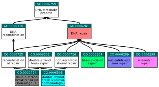 At the QuickGO (http://www.ebi.ac.uk/QuickGO) [21] platform, child terms that fall within the selected criteria were explored, beginning with the broad term ‘DNA repair’. Following steps similar to those described in Section 2.2.1, we ended up with the six GO terms presented in Table 4 and Figure 4.