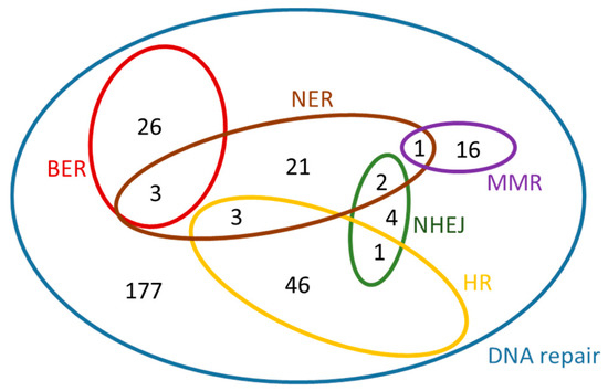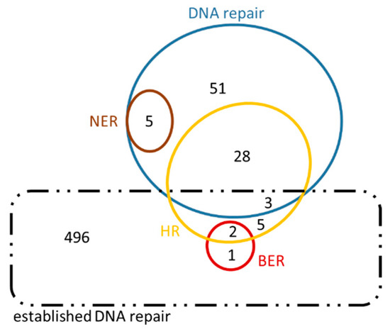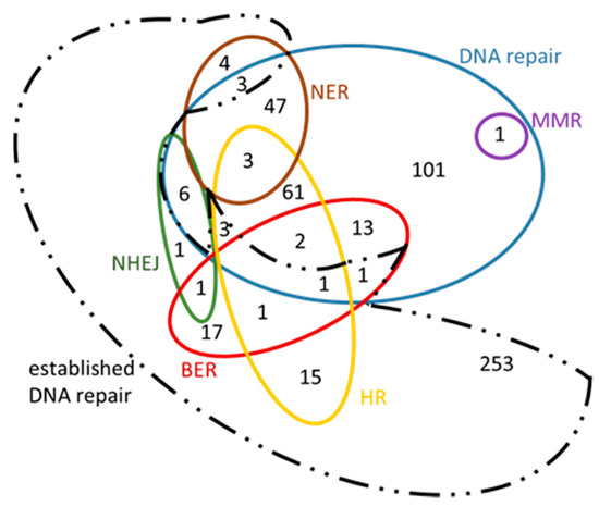 Our results are presented in Venn diagrams (Figure 8 and Figure 9), in a concise manner, avoiding the repetition of the common genes among the mechanisms. For the sake of completeness, we have included in these diagrams the intersection with the initial DNA repair genes, referred to as ‘established DNA repair genes’ (black dashed line in Figure 8 and Figure 9). In these Venn diagrams, only the genes of Supplementary Information: Tables S5–S10 that are not in bold, i.e., those genes that have arisen from the present analysis, are included. Thus, it is not surprising that some genes are found outside the DNA repair set (blue line Figure 8 and Figure 9) and they therefore fall into the ‘established DNA repair’ group.