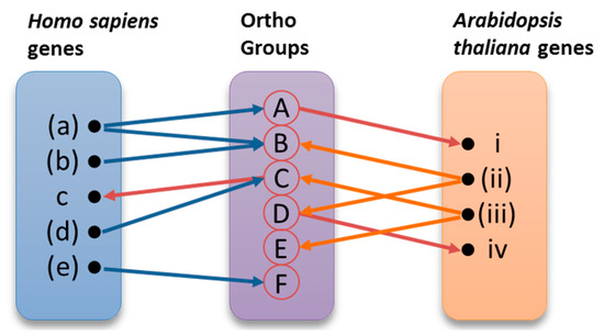 The derived twelve sets of genes were used as input to OrthoMCL-DB (http://orthomcl.cbil.upenn.edu) [29], providing for each gene a group of orthologues in the species under study. The results for the two species were collected and stored in a relational database. Data were combined in order to demonstrate known orthologies, propose new orthologies and, most importantly, suggest roles in DNA repair for orthologous genes. The orthologues pairing process, as well as the assignment of new roles to genes, are illustrated in Figure 7. Those of the initial genes that have been identified as annotated under the specific Gene Ontology (GO) terms are shown in parentheses. The same genes are represented in bold in the Supplementary Information (Tables S5–10), where the analytical results of this procedure can be found. Each one of these genes was used as input to Ortho MCL-DB, resulting to one or more Ortho Groups containing orthologous genes across several organisms. Ortho Groups A, B, and C contain both human and Arabidopsis genes. Ortho Groups D and E include only plant genes, while Ortho Group F contains only human genes. The overall procedure can be better described using the following example. As shown in Figure 7, the H. sapiens gene ‘(a)’ belongs to A and B Ortho Groups. The Arabidopsis gene ‘i’ was identified in group A, by virtue of orthology, without having been previously annotated under the initial GO term. Ortho Group B contains also the human gene ‘(a)’ and A. thaliana gene ‘(ii)’. For this reason, the previously characterized genes ‘(a)’ and ‘(ii)’ were paired as orthologues. These kinds of pairs are presented in Table 5 and Table 6. By using the A. thaliana gene ‘(ii)’ as query in OrthoMCL-BD, we identified the orthogroup D, which also contains the not yet annotated A. thaliana gene ‘iv’. On the other hand, H. sapiens gene ‘(e)’ belongs to group F, but since group F does not contain any A. thaliana gene, gene ‘(e)’ was eventually excluded from the results.