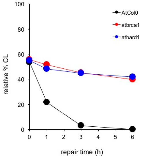 As shown in Figure 10, comparison of DDR kinetics revealed similarly reduced ability of the AtBRCA1 and AtBARD1 mutants to remove CL. Despite of the fact that wild type AtCol0 removed all CL after 3 h of DDR, residual DNA damage was observed in mutant AtBRCA1. The half-life of CL in AtBRCA1 and AtBARD1 (t1/2 = 10 h) is approximately 10 times longer compared to Col0 (t1/2 = 1.2 h). Therefore, AtBRCA1 and AtBARD1 can efficiently repair DNA interstrand cross-linked adducts generated by mitomycin C. On Figure 11 is shown the effect of SSB accumulation during the early stages of base excision repair (BER) recovery in Arabidopsis plants due to PARP1 impairment either by a knockout mutation leading to AtPARP1 or by two PARP1 inhibitors, the selective PARP1 inhibitor AG14361, developed by Pfizer for the sensitization of human breast cancer cells prior to irradiation treatment, or the non-specific PARP inhibitor 3-aminobenzamide (3-ABA). Of interest, the PARP1-mediated signaling is conserved among kingdoms, since the selective AG14361 inhibitor of HsPARP1 is also effective in Arabidopsis and exhibits the same repair kinetic behavior as the knockout AtPARP1 mutation, contrary to 3-ABA. The above observations lead to the suggestion that the genes AtBRCA1, AtBARD1 and AtPARP1 play an equally important role in DNA damage repair in plants, like Arabidopsis thaliana, as in animals and humans.