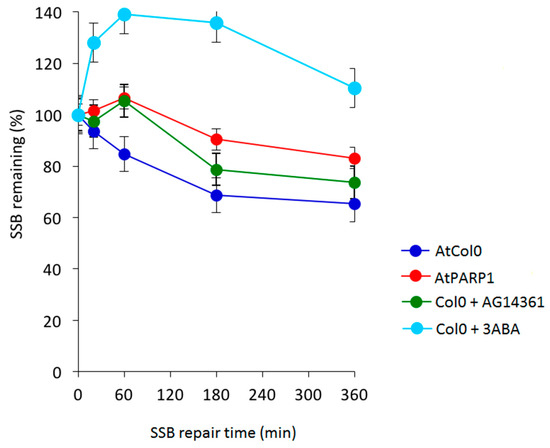 Effect of the knockdown mutation of AtPARP1 and of specific and broad spectrum inhibitors of PARP1 on SSB repair kinetics obtained by an A/N comet assay. SSBs generated following 1 hr treatment with 2 mM MMS (methyl methanesulfonate) in AtPARP1 and in Arabidopsis Col1, in the presence of 3 mM 3-aminobenzamide (3-ABA) and 10 μM HsPARP1 specific AG14361 inhibitors.