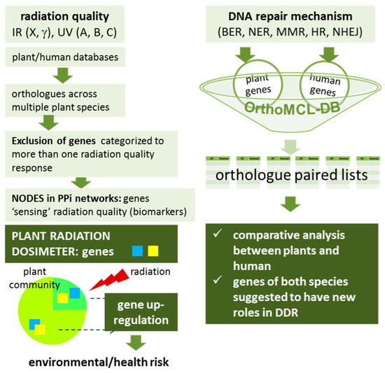 Herein, we describe the design of an in silico method to identify and rescue the best candidate genes for the plant radiation biodosimeter by conducting a comparative analysis of genes implicated in DDR both in animals and plants. Towards this end, the DDR-related genes of human and Arabidopsis thaliana, representing the animal and plant kingdom, respectively, were compared.