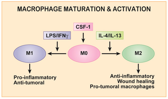 Colony-stimulating factor-1 (CSF-1) induces macrophage precursors to mature into adherent, motile baseline macrophages (M0). M0 macrophages are then activated into pro-inflammatory macrophages by IFNγ and LPS or anti-inflammatory, pro-tumoral macrophages by IL-4 or IL-13. Definitions: LPS, lipopolysaccharide; IFNγ, interferon-γ; IL, interleukin.
