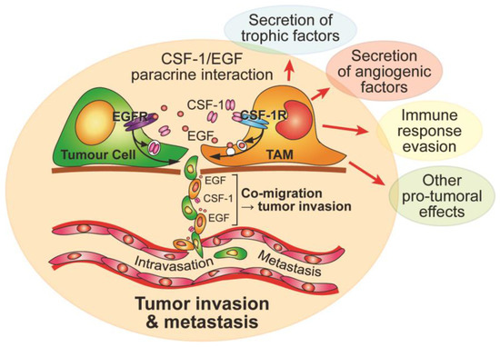 Contribution by tumor-associated macrophages (TAM) to tumor progression with an emphasis on tumor invasion and metastasis. TAMs secrete epidermal growth factor (EGF) and tumour cells secrete CSF-1 to induce a paracrine loop-driven co-migration and invasion of both cell types towards blood vessels.