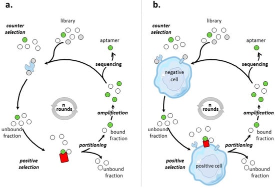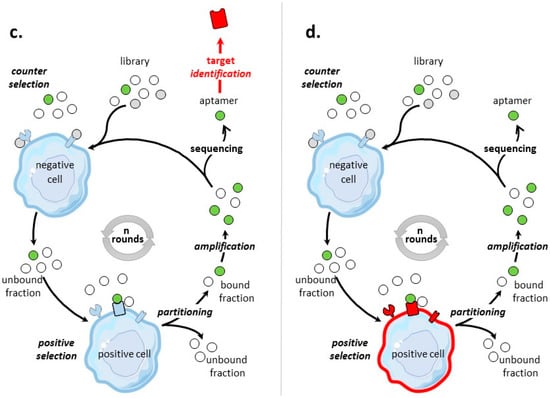 (ii) unrelated to cells used for positive selection. Two studies [,] related the use for positive selection of the breast cancer cell line SK-BR3 modified to overexpress HER-2. For counter-selection, the human breast cell types MDA-MB-231 and MDA-MB-468, respectively underexpressing and negative for HER-2 were used. Twelve and sixteen rounds of selection were performed to select RNA- [] and ssDNA- [] aptamers. According to Dastjerdi et al. [], the use of the HER2 underexpressing cell line (MDA-MB-231) in Kang et al’s study [], instead of a HER2-negative cell line may have compromised counter selection. A hybrid-SELEX strategy was used to get aptamers to the surface transmembrane glycoprotein CD30 []. For the cell-SELEX, lymphoma cells K299T and Jurkat cells were used for positive and counter-selection, respectively.