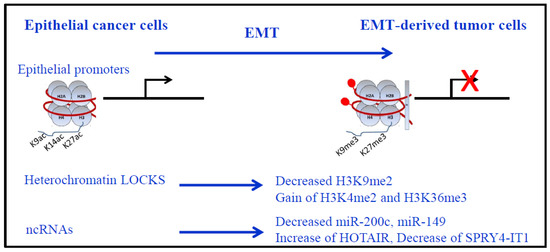 Recent studies showed that specific “long-range” chromatin domains across the genome, called “LOCKs”, found in non-repetitive heterochromatin domains up to several megabases, are epigenetically remodeled as a major driving force during EMT [97]. A global reduction in the heterochromatin mark H3K9me2, an increase in the euchromatin mark, H3K4me3, and an increase in the transcriptional mark, H3K36me3, were described (Figure 2). These changes depended largely on LSD1. Of interest, DNA methylation was preserved across the genome during EMT.