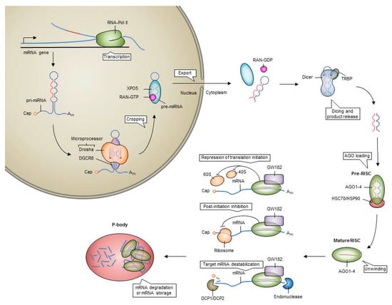 - Ha, M.; Kim, V.N. Regulation of microRNA biogenesis. Nat. Rev. Mol. Cell Biol. 2014, 15, 509–524. [Google Scholar] [CrossRef] [PubMed]