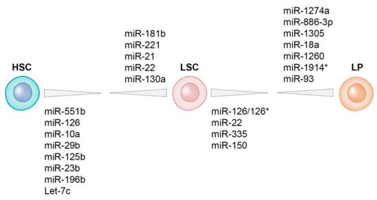 By using aldehyde dehydrogenases (ALDH) activity miRNA expression profiles of LSCs, leukemic progenitors and HSCs all obtained from the same AML sample were obtained [,]. This approach resulted in identification of miRNAs differentially expressed between LSC and HSC populations and between LSCs and leukemic progenitors []. Several of those miRNAs showed to be specifically expressed in LSCs and/or HSCs, and to have prognostic value in AML and/or to function as targets for miRNA-based anti-LSC therapy [,].